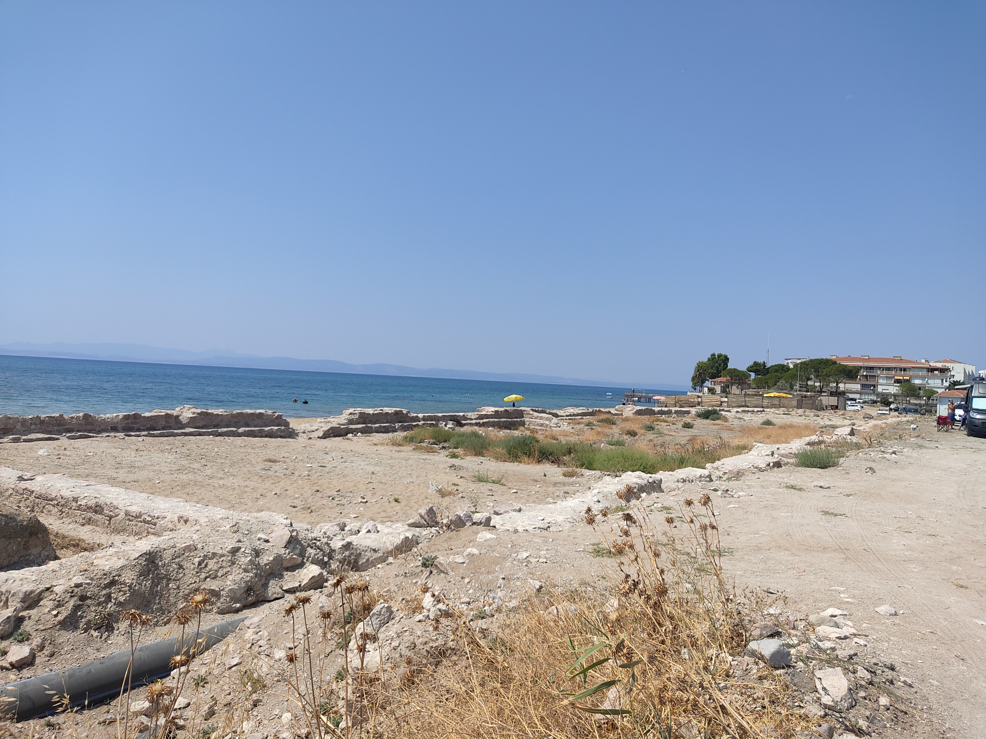 Akkuşlar plajının kumları arasında yitip giderken, varislerinin teşebbüsü ile, yeniden ortaya çıkarılan, Rumlardan kalan bir tuz üretim mekezi binasının temelleri. Bir zamanlar buradan Midilli adasına tuz sevkiyatı yapılmış.